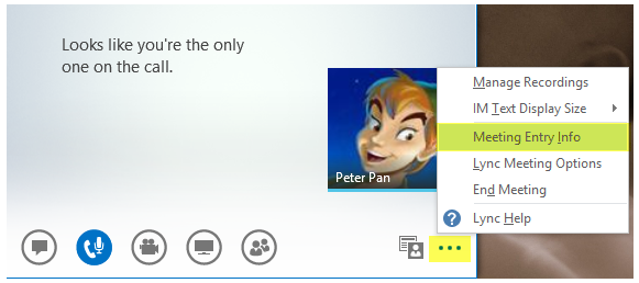 If you are planning to share content with external parties that don’t have Lync you will need to provide them the meeting link. This can be accessed from the additional options menu (…) by selecting “Meeting Entry Info”: