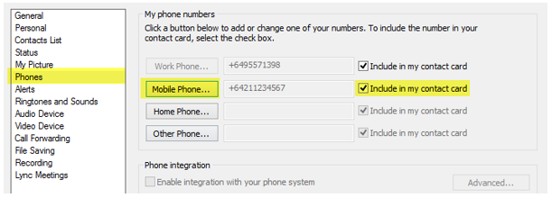 Select “Phones” then click the phone number type you would like to add. Use the “Include in my contact card” to make it easily visible to your Lync contacts: