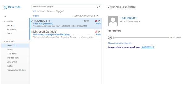 - Outlook – Voicemail is delivered to your Outlook inbox and can be played directly from the message:
