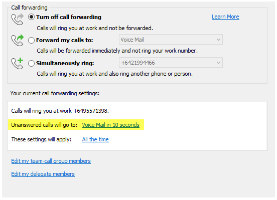 By default if voicemail is enabled unanswered calls will be redirected to your voicemail box. You can change these settings from the “Call Forwarding Settings” option mentioned above.
