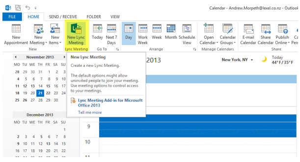 A meeting between co-workers and other contacts is easy using Lync. Simply select “Meet Now” from cog menu: