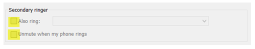 If you have 2 audio devices you may want to also enable the “Secondary ringer” option. This is particularly useful if your primary device is a headset, and you would like to set your PC speaker as the ringer. It is also advisable to “Unmute” when the phone rings:
